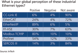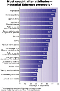 Mas já não é variedade de protocolos o foco das últimas pesquisas mas os diversos tipos de Ethernet à disposição no mercado. Conceitualmente Ethernet é o mais protocolo estudado nos dois últimos anos, principalmente por seus benefícios de conectividade – lembre-se que o desejo de intercambiabilidade é real e ela precisa funcionar num ambiente total e verticalmente integrado. De acordo com a Reed Corp.Reseach, 53% das empresas entrevistadas declarou que a engenharia estava envolvida com o assunto, 34% do pessoal de TI, 23% dos engenheiros da planta, 22% dos gerentes da fábrica e 8% dos clientes e dos fornecedores de suporte técnico.
