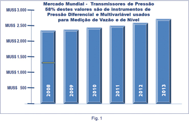 O gráfico da Fig. 1 ilustra os valores dessa pesquisa. Note-se que, dos valores de vendas totais de instrumentos de pressão mostrados, 58% do ano de 2008 corresponderam a medidores de pressão diferencial usados em vazão e nível. Visite o endereço http://www.arcweb.com/Research/Studies/Pages/Pressure_Transmitters.aspx para visualizar os tópicos detalhados nesta pesquisa. |