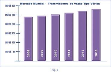 O gráfico da Fig. 3 ilustra os valores da pesquisa com transmissores desse tipo. Visite o endereço http://www.arcweb.com/Research/Studies/Pages/VortexFlowmeters.aspx para visualizar todos os tópicos detalhados nesta pesquisa. |