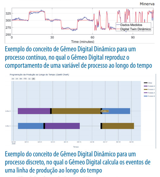 E são os executivos da Minerva que frisam que é possível criar um gêmeo digital de quase qualquer coisa: um Gêmeo Digital Dinâmico de um processo industrial replica o seu comportamento ao longo do tempo, e permite, por exemplo, simular diferentes cenários de operação; um Gêmeo Digital Dinâmico de uma linha de produção ou linha de montagem de uma empresa de manufatura permite, por exemplo, predizer com precisão a sua produção ao longo do tempo, levando em consideração as reais condições do processo, o que é útil para avaliar o impacto de mudanças no processo antes de realizálas, e também é uma ferramenta muito útil para Planejamento e Programação de Produção. |