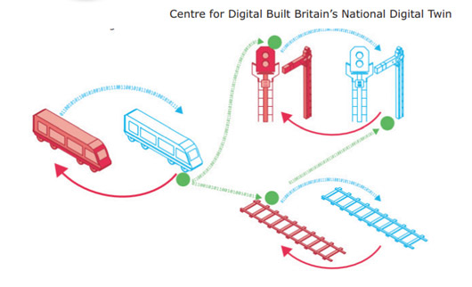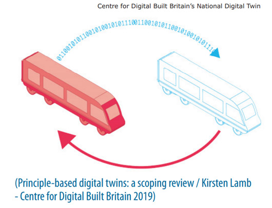 Um gêmeo digital tem uma relação recíproca com seu gêmeo físico. Por exemplo, um vagão de trem pode enviar dados para um modelo digital de si mesmo, enquanto o gêmeo digital irá analisar a temperatura, ocupação ou desempenho do carro, e pode fazer intervenções positivas, como alterar os controles de clima, ou enviar uma solicitação de manutenção. |