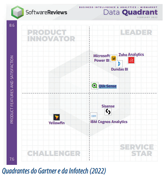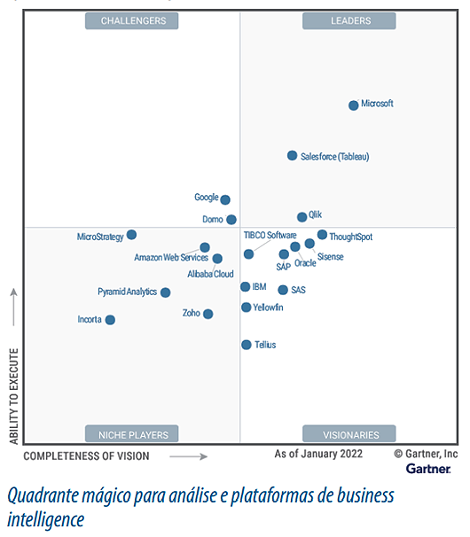 | Mas qual plataforma usar? Mesmo as listas deste ano apontam que nem todas oferecem os mesmos serviços e recursos, ou seja, é preciso tempo para analisar qual a mais adequada para o seu negócio. E há diversas listas, então, condensando algumas, podemos listar o Microsoft Power BI como plataforma geral de BI; o Tableau Desktop como recente destaque para visualização e fontes grandes de dados; Dundas BI, uma plataforma baseada na web; uma plataforma especializada em Inteligência Artificial como a Sisense; a conhecida integradora SAP; uma plataforma voltada para pequenas empresas e uma pessoa, Microstrategy; uma com enorme espaço no serviço, como a Amazon; uma que seja mais barata, como a Tibco Spotfire; uma plataforma bem conhecida, como a Zoho. É trabalho hercúleo, que demanda ter boas noções de TI, e bons parceiros, porque nem os quadrantes especializados definem qual seria a melhor plataforma para este ou aquele negócio – ainda que os quadrantes tragam quase a mesma fotografia do setor.