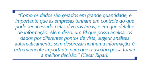“Normalmente, os dados utilizados pelo BI são provenientes de sistemas internos das empresas (ERPs, CRMs, bases de dados corporativas e departamentais, etc.), e podem ser combinados com dados externos. O Data Warehouse pode ser uma fonte rica de informações para os sistemas de BI. Como os dados são gerados em grande quantidade, é importante que as empresas tenham um controle do que pode ser acessado pelas diversas áreas, e em que detalhe de informação. Além disso, um BI que possa analisar os dados por diferentes pontos de vista, sugerir análises automaticamente, sem desprezar nenhuma informação, é extremamente importante para que o usuário possa tomar a melhor decisão”, diz Ripari, da Qlik.